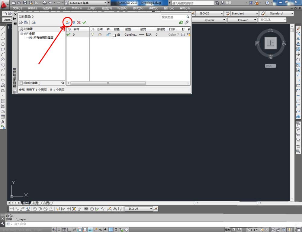 1、打开AutoCAD 2013软件,点击【图层特性管理器】,点击【新建图层】,将图层命名为:二门推拉衣柜。点击色块,按图示设置一个图层颜色,完成二门推拉衣柜图层的设置(如图所示);