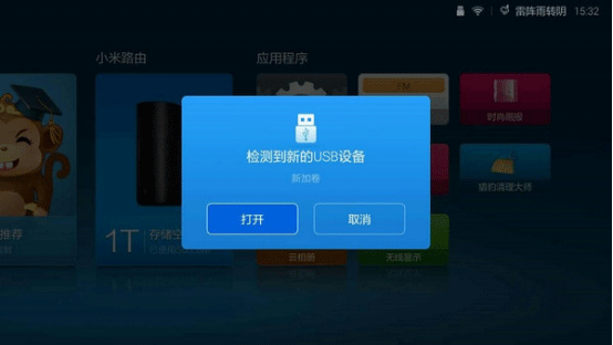 1、把U盘插入小米盒子的USB接口,小米系统会自动检测到插入的U盘,点击“打开”选项: