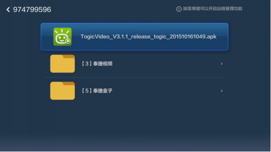 3、选中文件之后,点击遥控器确认键,进行安装,安装完成之后,就能在小米电视首页找到泰捷视频,观看高清电视直播了。